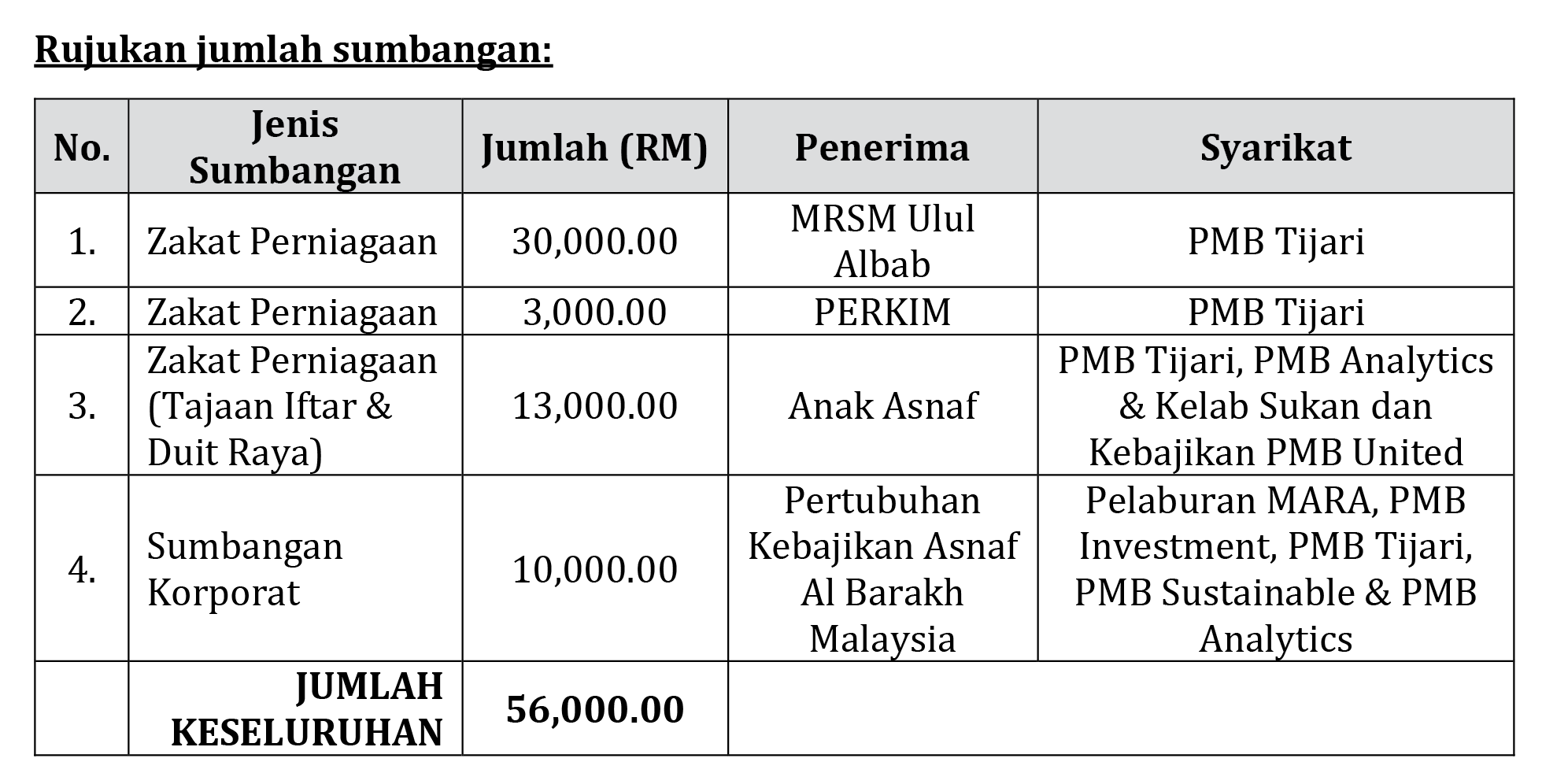 Dalam pada itu, tajaan zakat perniagaan untuk iftar dan duit raya anak asnaf di bawah Pertubuhan Kebajikan Asnaf Al Barakh Malaysia berjumlah lebih RM13,000.00 pula disumbangkan oleh PMB Tijari, PMB Analytics Sdn Bhd (PMB Analytics) serta kelab sukan dan kebajikan PMB United.